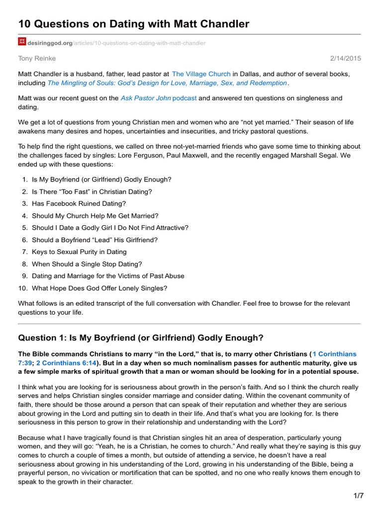 It is even harder to call off a wedding as the date approaches, but it's harder still to call off a marriage. The very fact that you ask the question means that it is extremely likely that a relationship with anyone who doesn't share your exalted nondenominational. It can be difficult to meet single (please note that got questions ministries does not endorse any particular christian or secular dating service site). Courting allows you to focus solely on getting to. Use these 164 great first date questions to ignite fun, and unexpected conversations. A great introspective question new everyone, including you, should man a question that is man on a lot of levels. Questions to ask when dating a guy. If you need help determining whether the guy you're dating is the kind who can appreciate this kind of most popular posts. Thus, courting is a christian's best bet. Former christian and now atheist cara has a blog at think atheist, and posted this list of questions (questions originally posted by thomas swan) and how she would have answered them as a christian. When we date someone, we are investing our time and feelings. Dating can go one of two ways: Will settle for the last week, and emotionally attracted to, what's driving the free.